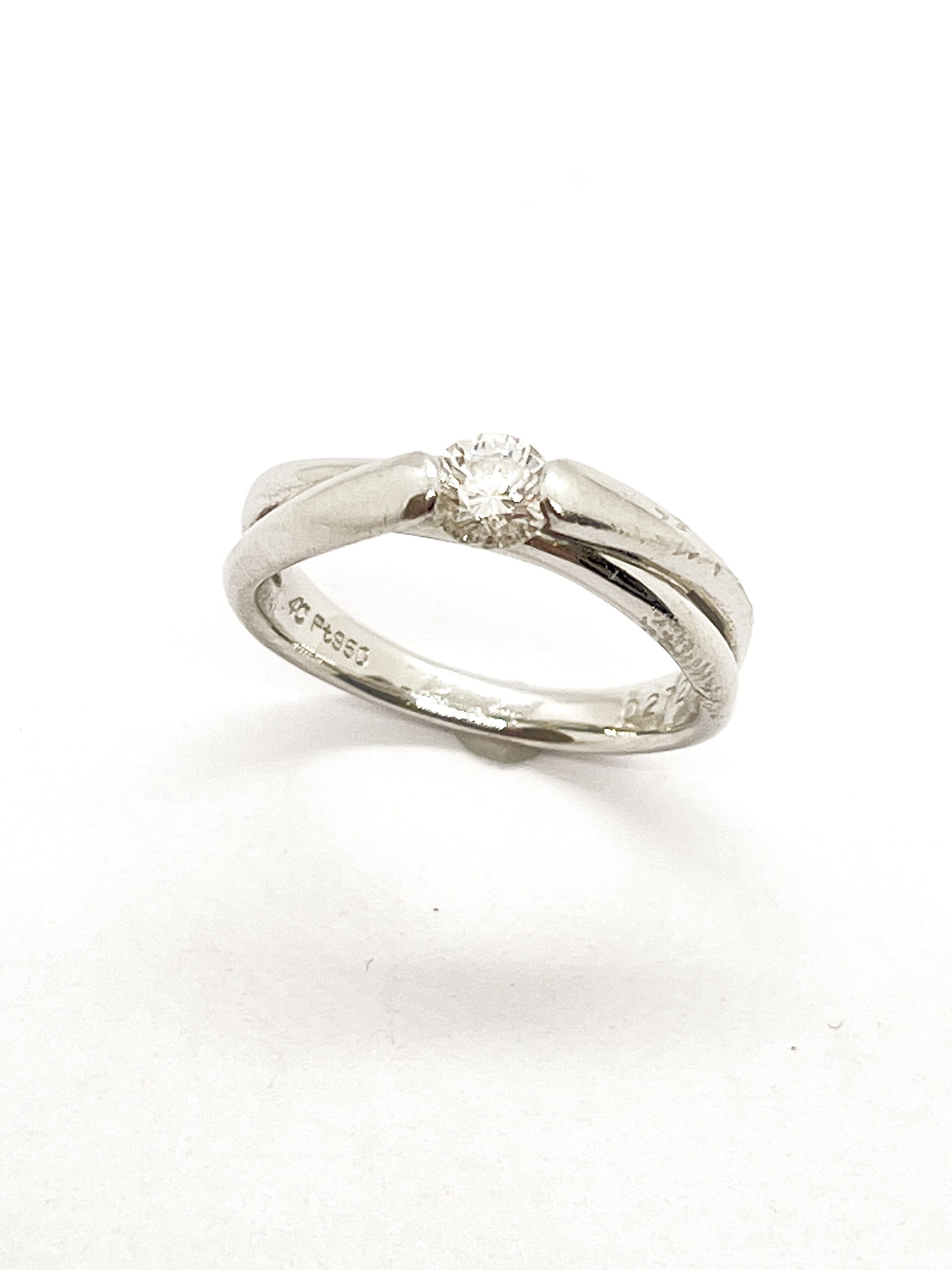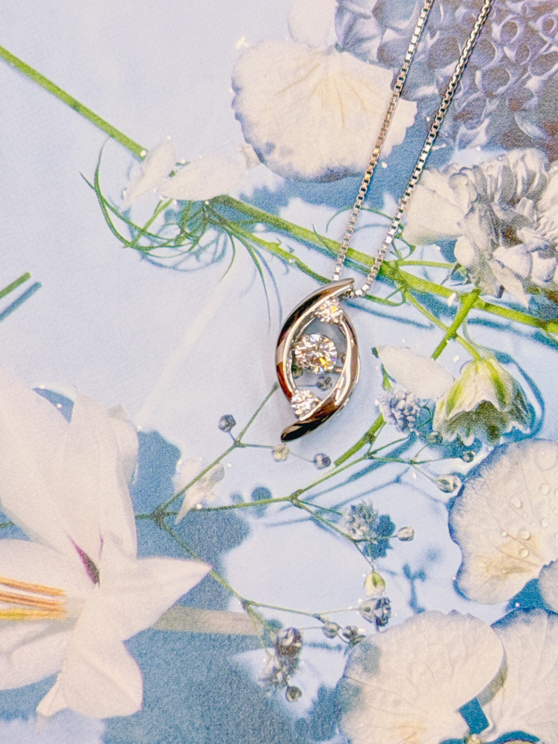 ご主人様から婚約指輪として頂いたダイヤモンドリングを普段使いしやすいペンダントにリフォームいたしました。最初のご希望は、シンプルな6本爪をご希望でしたがお石のサイズが0.27ctだったこととご年齢的に多少ボリュームがあるデザインの方がお似合いでしたのでダンシングタイプをご提案いたしました。